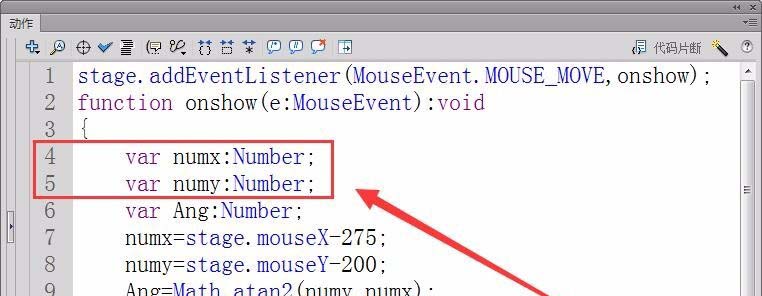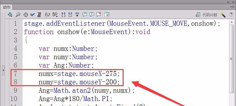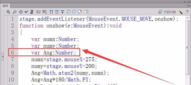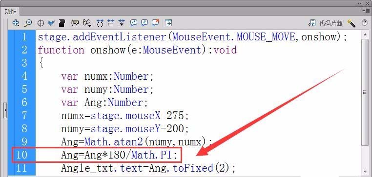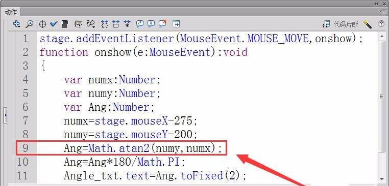 9、用反正切函數(shù)Math.atan2計(jì)算出鼠標(biāo)相對(duì)于舞臺(tái)中心的角度,保存在變量Ang中。