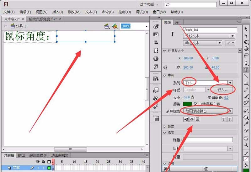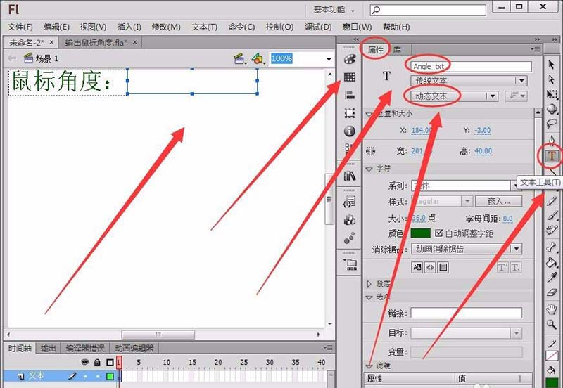2、選擇編輯欄中的文本工具,選擇屬性面板中的動(dòng)態(tài)文本,在舞臺(tái)繪制一個(gè)動(dòng)態(tài)文本框,將實(shí)例名稱取名為Angle_txt。(注:要嵌入字體,動(dòng)態(tài)文本才能在舞臺(tái)正常顯示)