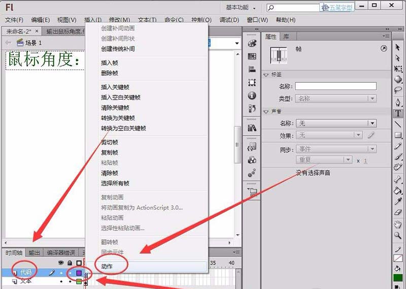 3、新建一個(gè)圖層命名為代碼,在圖層的第1幀右擊,選擇動(dòng)作選項(xiàng)。