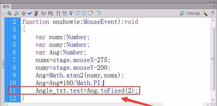 11、將角度值用函數(shù)toFixed取小數(shù)點(diǎn)后兩位,用屬性text在舞臺(tái)的動(dòng)態(tài)文本框Angle_txt中,輸出角度值。
