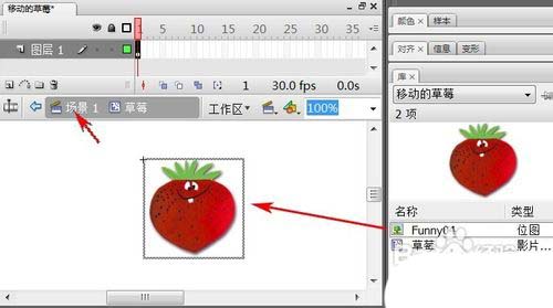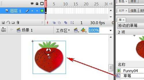 9、選擇場景“圖層1”第1幀,把“草莓”元件拖到場景中。
