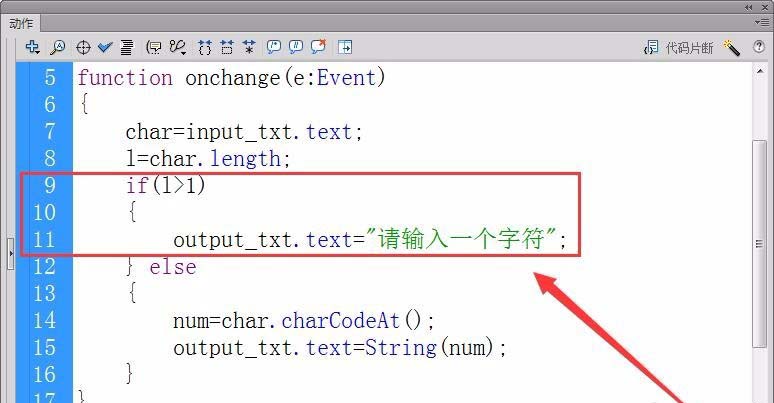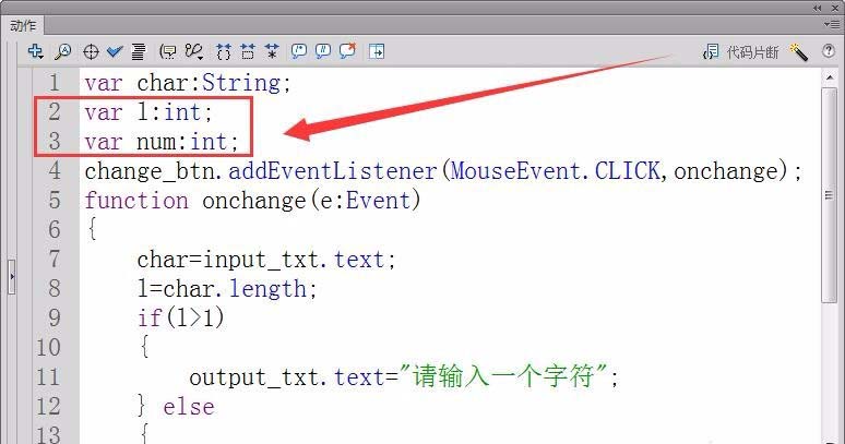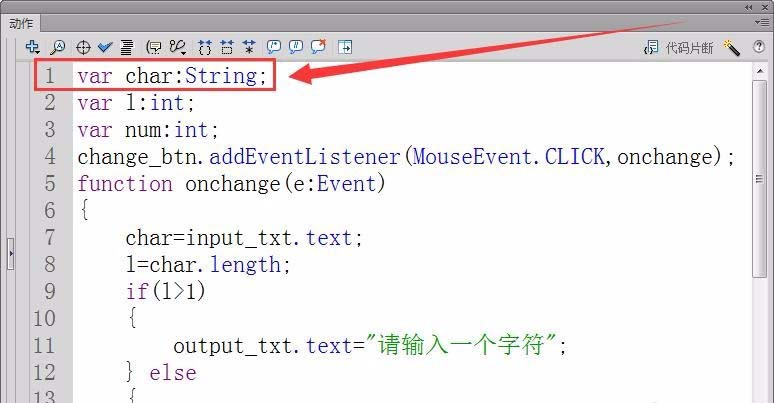 4、新建一個(gè)代碼圖層,打開動(dòng)作面板。首先,定義一個(gè)字符型變量char,用來(lái)保存輸入的字符。