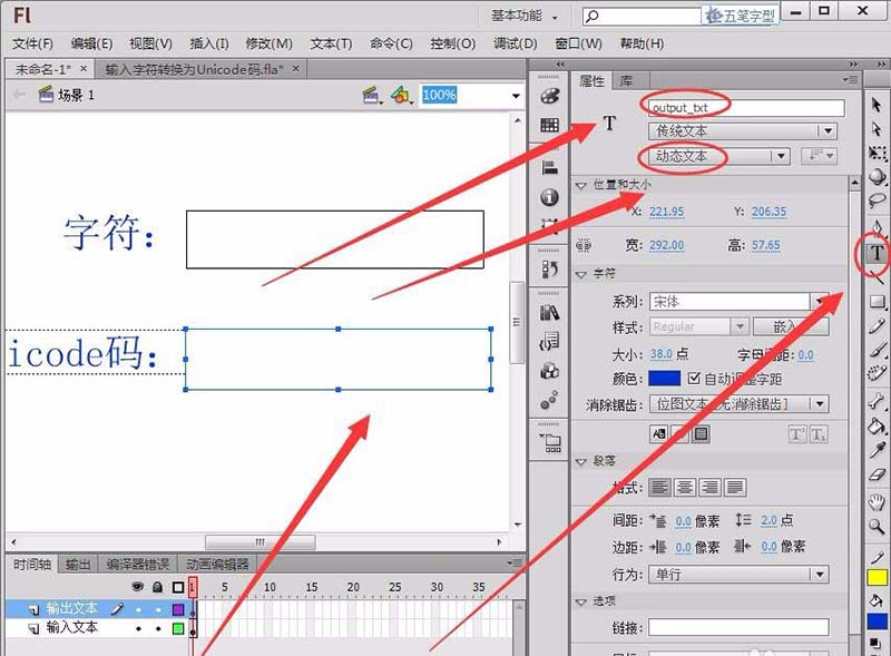 2、接著,用文本工具繪制一個(gè)動(dòng)態(tài)文本框,實(shí)例名稱取名為“output_txt”。
