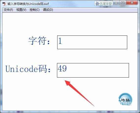 12、運(yùn)行程序,在“字符”輸入框中輸入任一字符,單擊“轉(zhuǎn)換”按鈕,在“Unicode碼”輸出框中,即輸出該字符的Unicode碼。