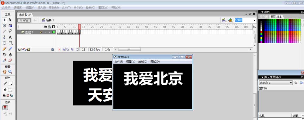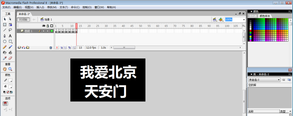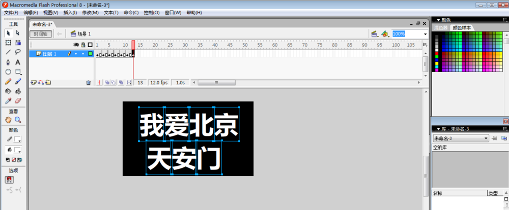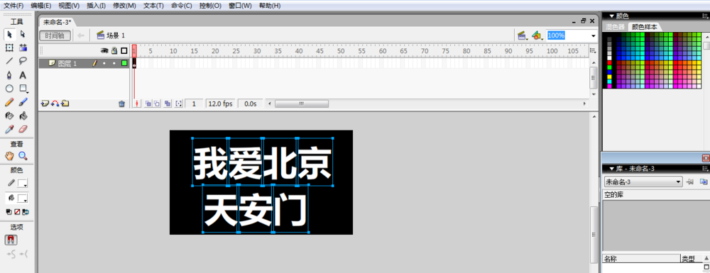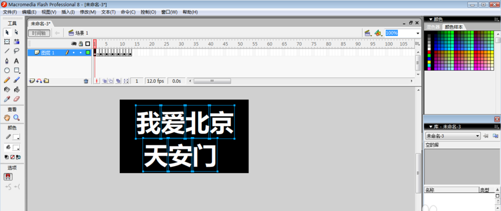 2、用文本工具在舞臺上輸入“我愛北京天安門”并將文字打散