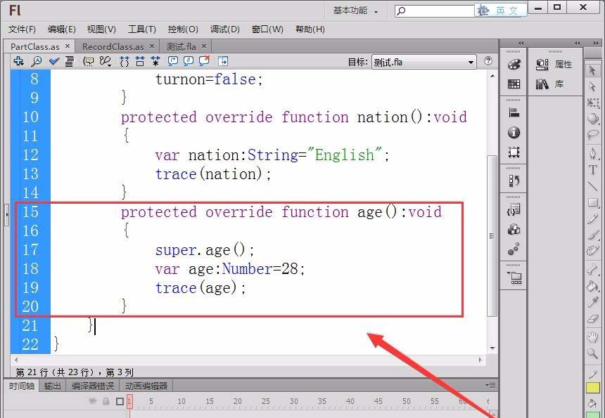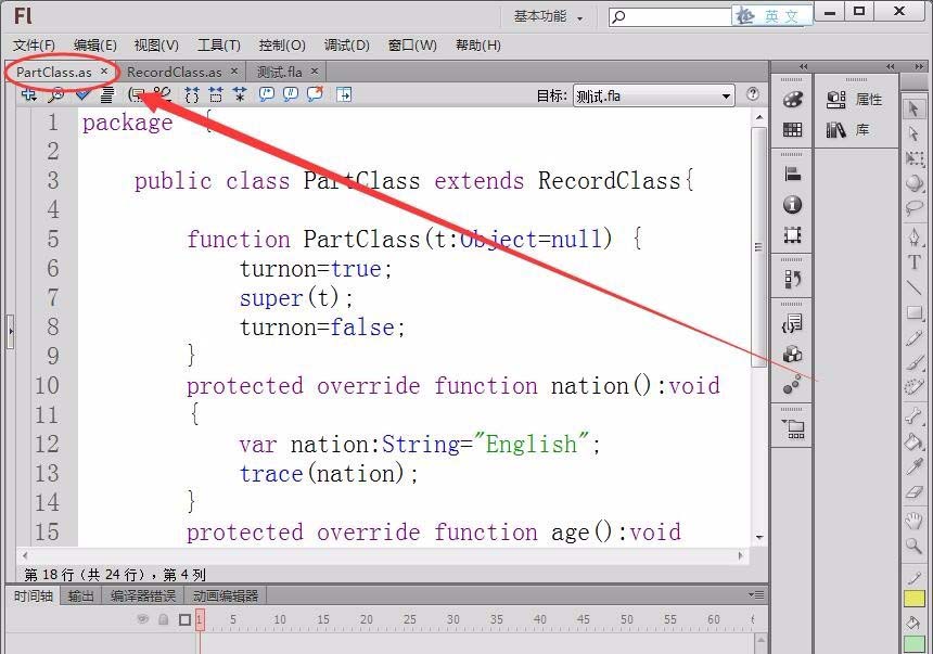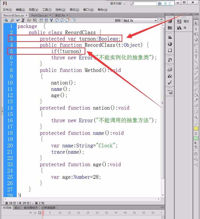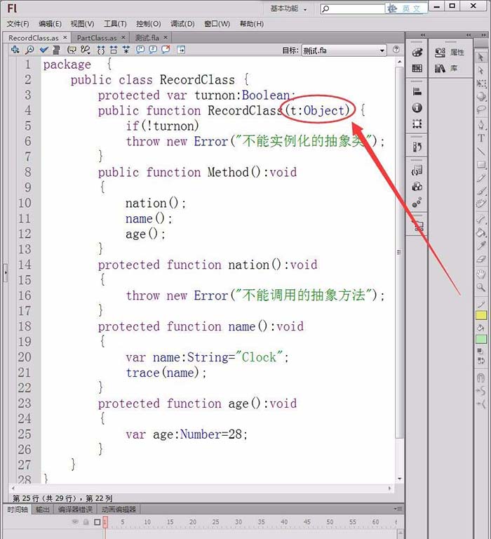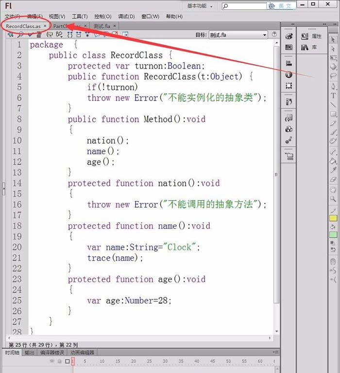 1、最后,新建一個Flash文檔,調(diào)用模板方法的父類和子類,測試模板方法。