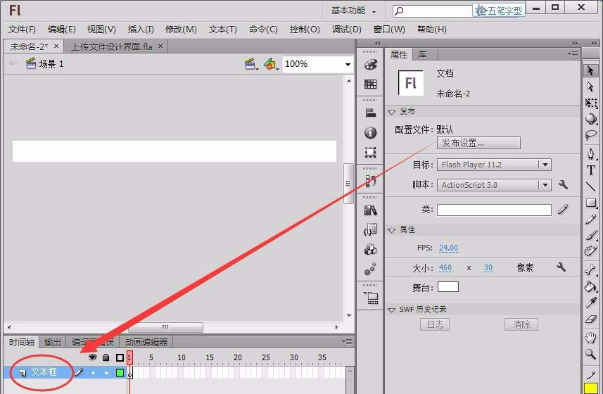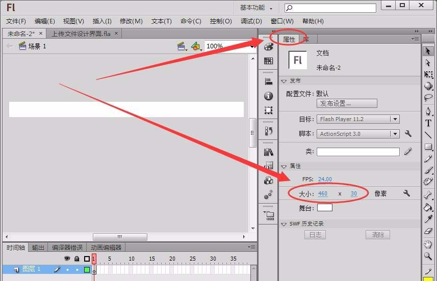 2、用鼠標在舞臺上單擊,在屬性面板中,將寬度改為460像素,高度改為30像素。