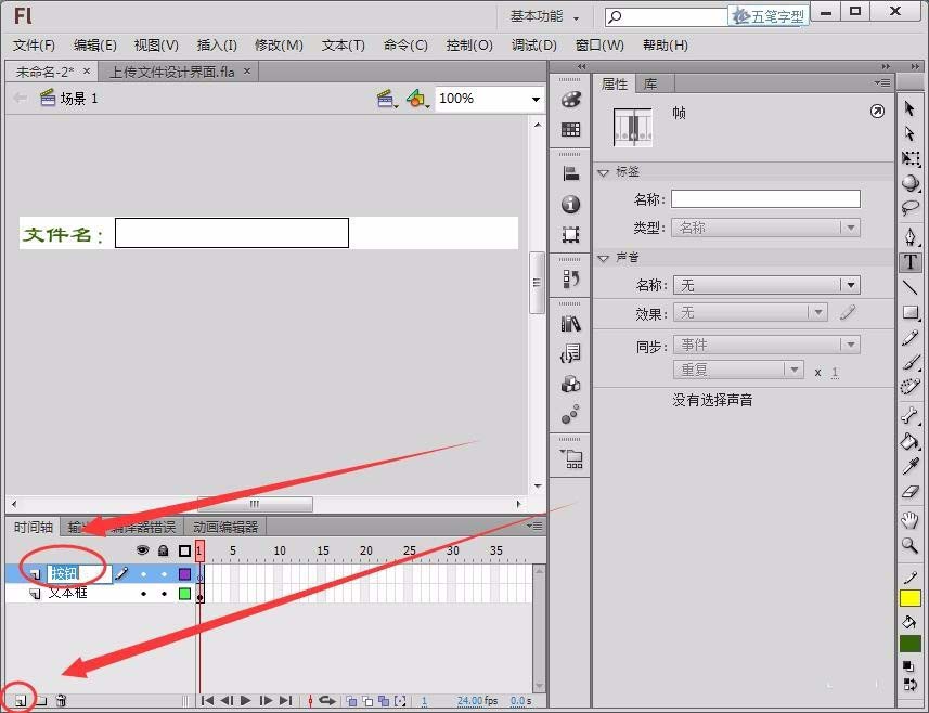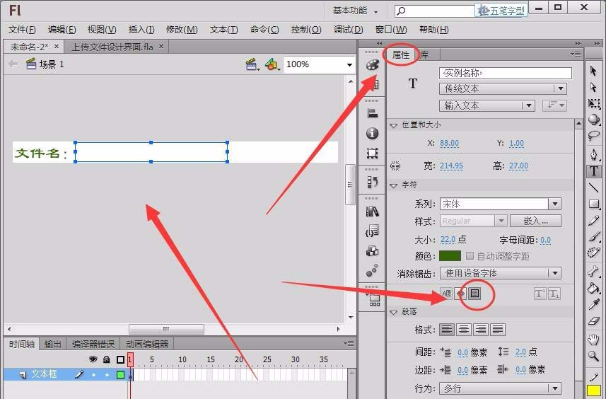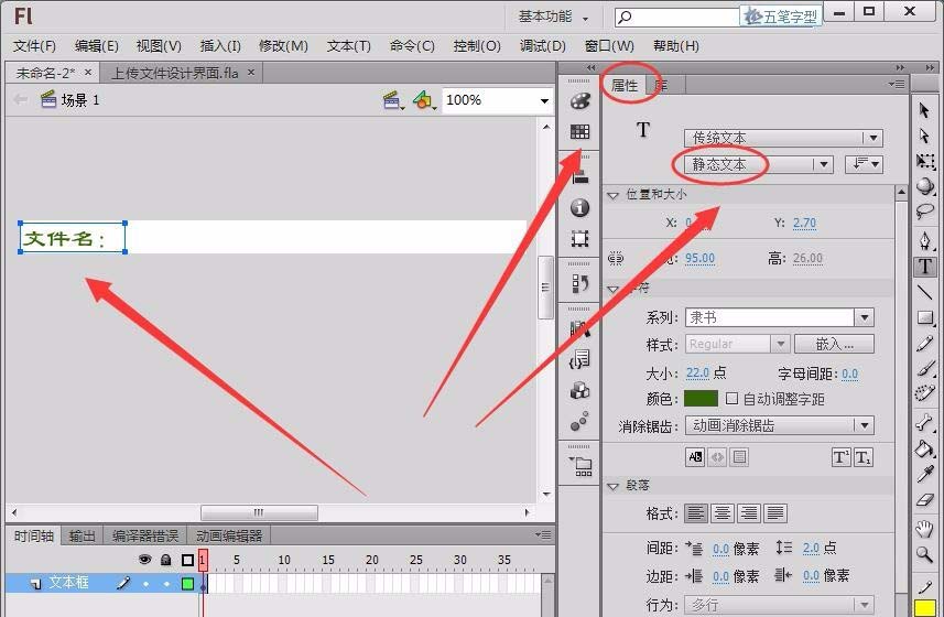 4、選擇“文本工具”,在舞臺中繪制一個靜態文本框,內容為“文件名”。