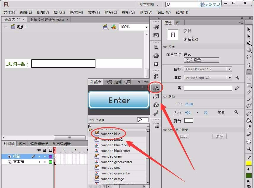 7、打開外部庫,選擇一種合適的樣式,插入兩個按鈕到舞臺中。