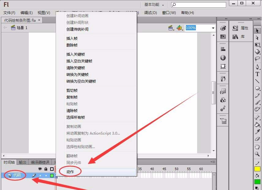 1、新建一個Flash文檔,將圖層1重命名為代碼,打開動作面板。