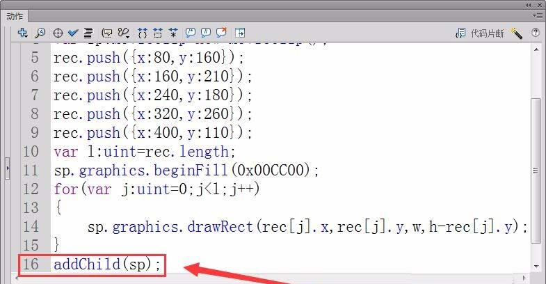 11、最后,將影片剪輯實例sp添加到顯示例表中,使柱形顯示在舞臺中。