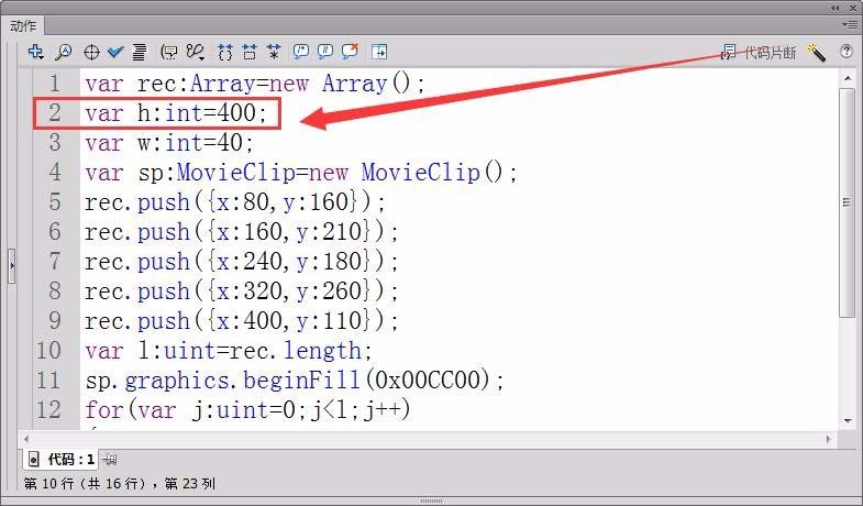 3、定義一個整型變量h,用來保存舞臺的高度,值為400。
