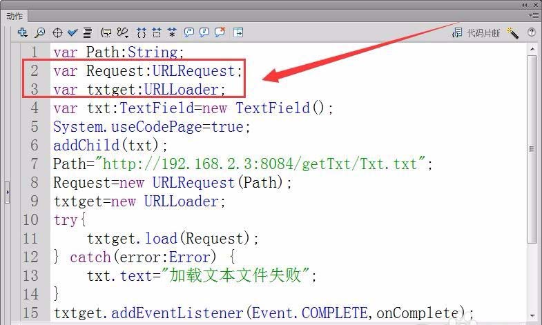8、創建URLRequest和URLLoader類型實例,實例名為Request和txtget。