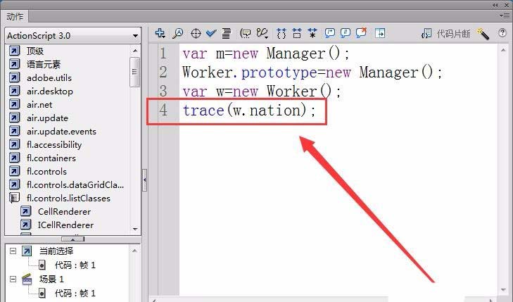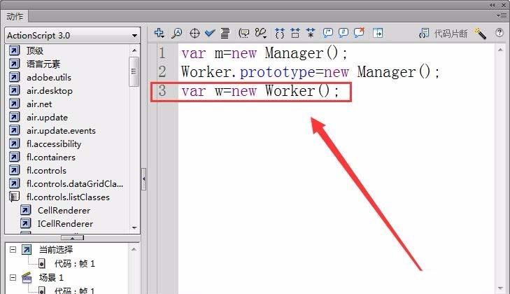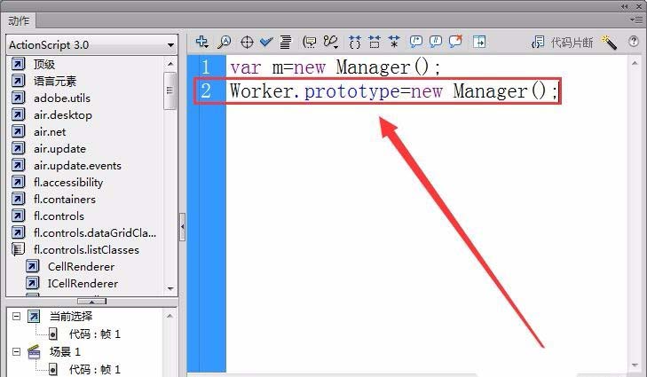 5、接下來,在fla文件中以Manager類為Worker類的原型,使用代碼改變Worker.prototype,讓其包含一個Manager對象。