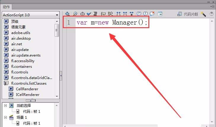 3、新建一個Flash文檔,打開動作面板。創建一個Manager類的實例,用變量m來引用它。