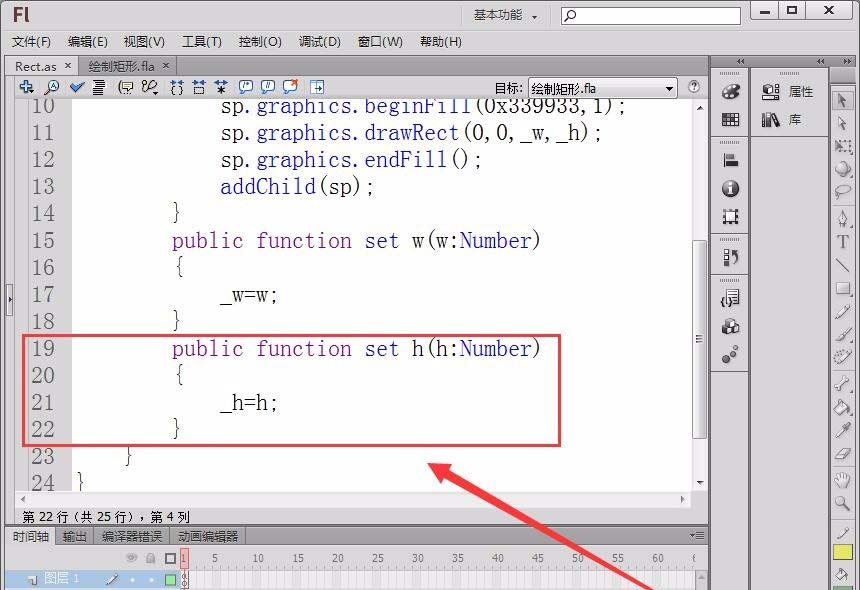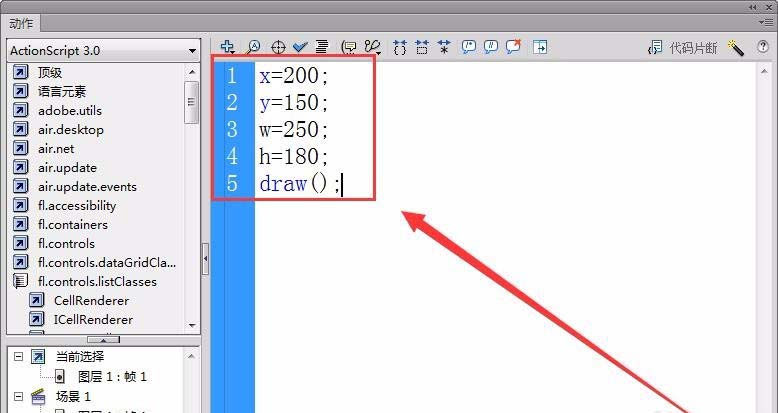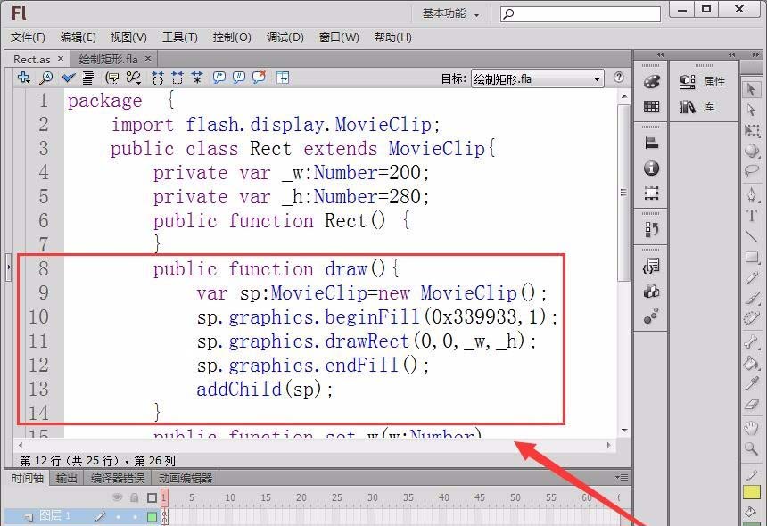 9、創建一個Flash文檔,打開動作面板。調用文檔類的方法draw,輸入寬和高,就可以繪制簡單的矩形了。