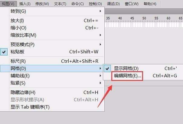 4、點擊網格選項,在其子級菜單里找到顯示網格選項,可以看到在舞臺上就出現了網格,如圖所示:
