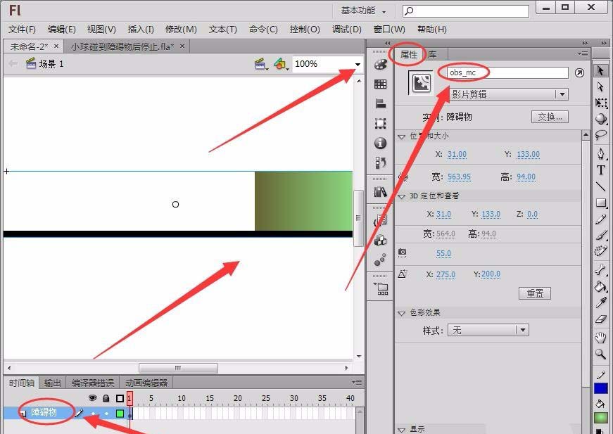 1、在舞臺繪制一個障礙物,將其轉換為影片剪輯元件,在屬性面板中將實例名稱取名為“obs_mc”。