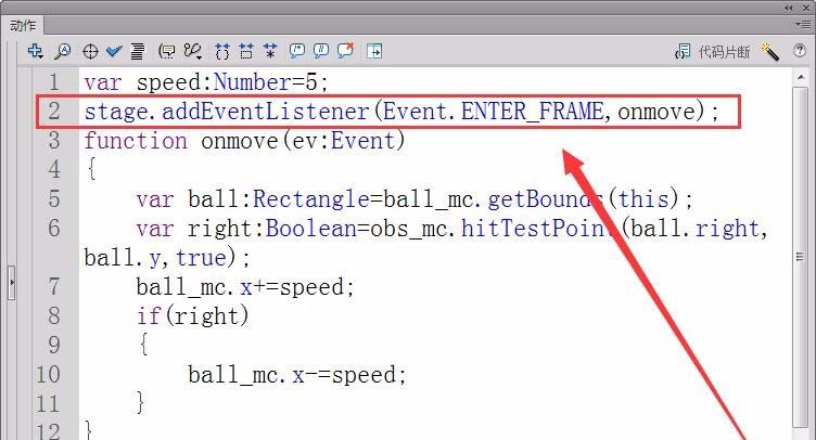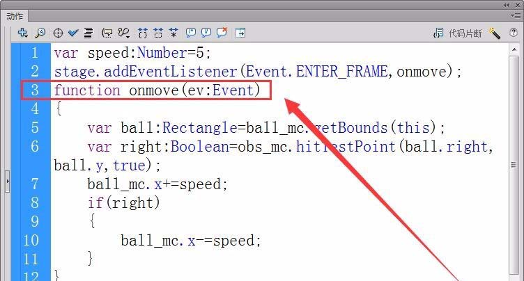 4、注冊舞臺enterframe事件的偵聽器,函數onmove用來控制小球的運動。
