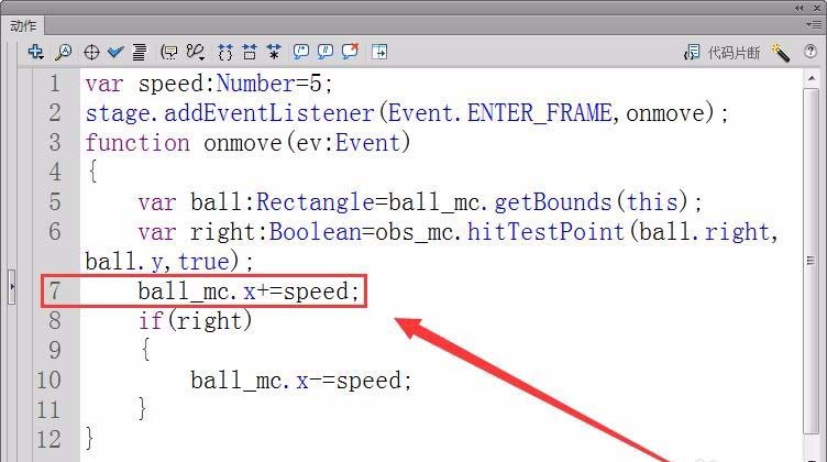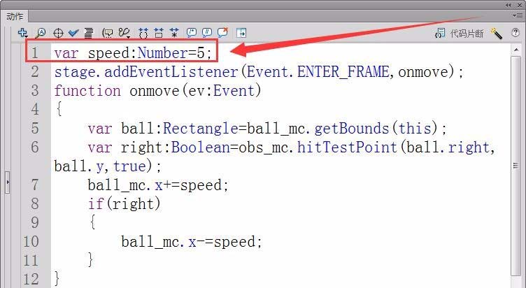 3、新建“代碼”圖層,打開動作面板。首先,定義小球運動速度的變量speed,設置值為5。