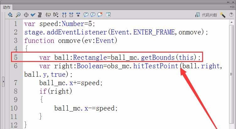 6、定義一個Rectangle類型變量ball,用getBounds獲取小球ball_mc背景矩形區域的四個頂點坐標,保存在ball中。