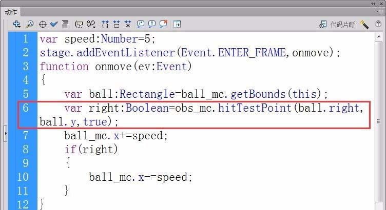 7、然后,檢測運動小球的右上角是否與障礙物相碰撞,用hitTestPoint函數實現檢測。