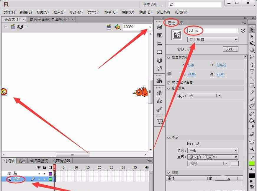flash中想要制作一個動畫效果,就是使用鼠標點擊屏幕后,花朵樣式的子彈飛出擊中小鳥,然后小鳥消失,該怎么制作呢?下面我們就來看看詳細的教程。