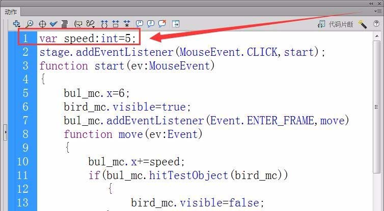 3、新建一個代碼圖層,打開動作面板。首先,定義一個整型變量speed,獲取子彈飛行的速度。