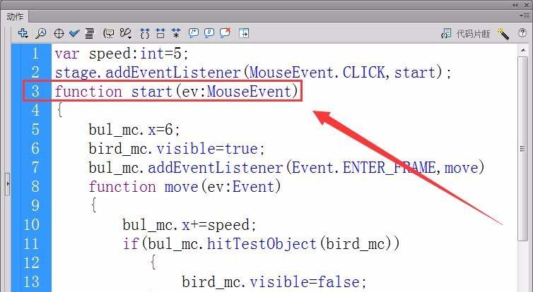 4、接著,注冊舞臺的鼠標單擊事件的偵聽器,接收者函數用于控制子彈飛出。