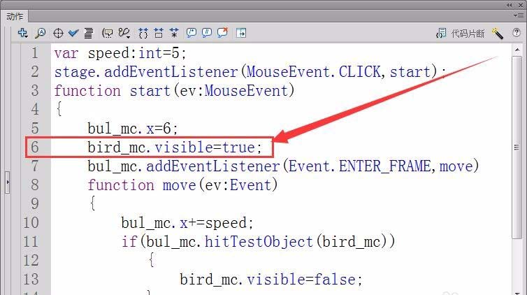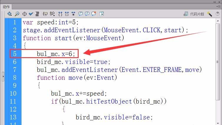 8、注冊子彈的enterframe事件的偵聽器,接收者函數控制子彈飛行擊中小鳥后的顯示。