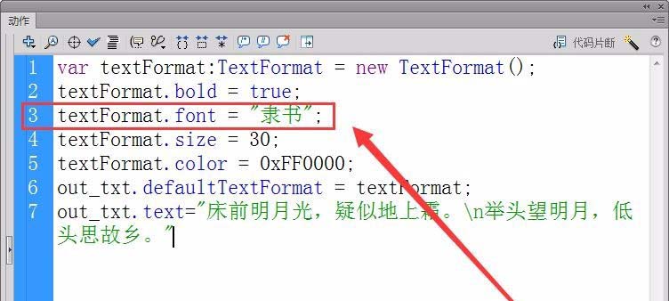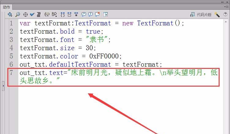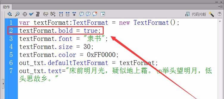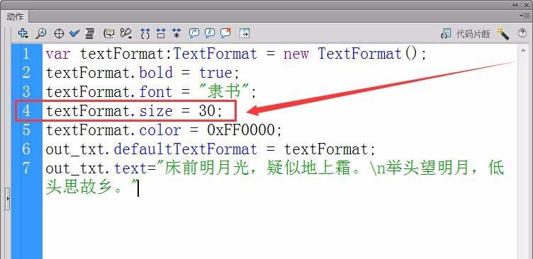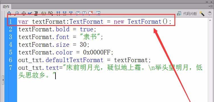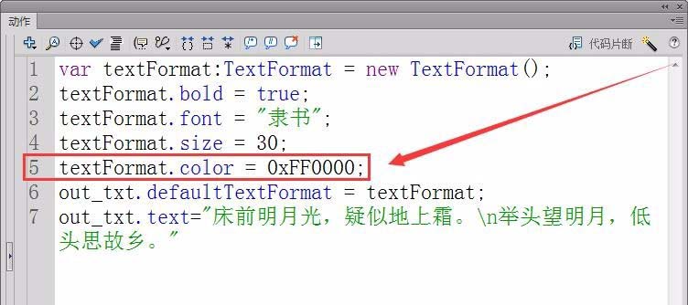 3、首先,創(chuàng)建一個TextFormat實例,用變量textFormat引用它,保存文本要設置的格式。