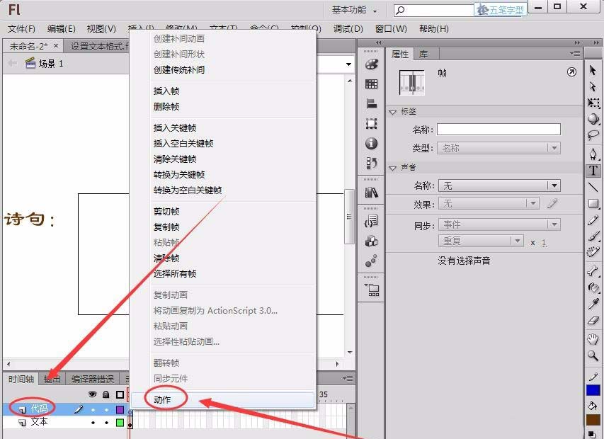 2、新建一個圖層,命名為“代碼”,在第1幀右擊,打開“動作”面板。