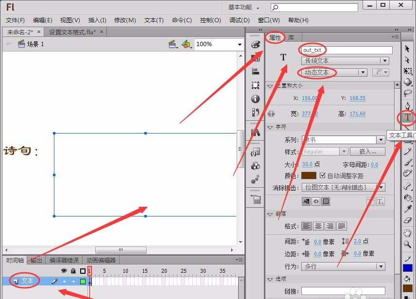 1、在編輯欄選擇文本工具,在舞臺繪制一個輸出詩句的動態(tài)文本框,在屬性面板中將實例名稱取名為“out_txt”。