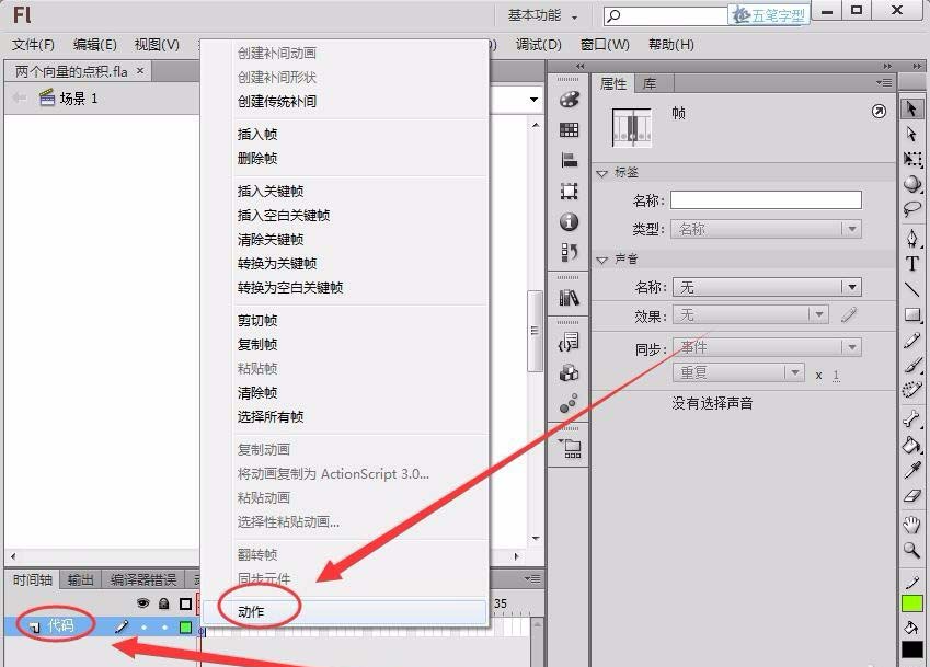 4、新建一個Flash文檔,將圖層命名為代碼,在代碼圖層的第1幀右擊,打開動作面板。