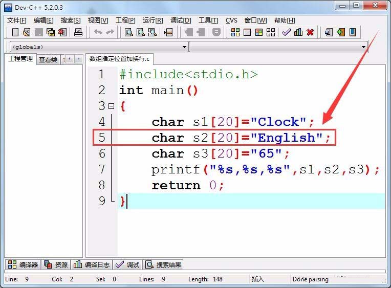 7、用printf語句,輸出三個字符串的值,如下圖所示。