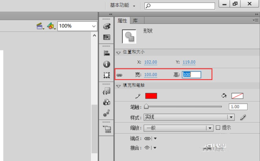 6、調(diào)整右側屬性面板,將寬、高均調(diào)整為100(根據(jù)自己需要修改)。這樣,正方形就繪制好了