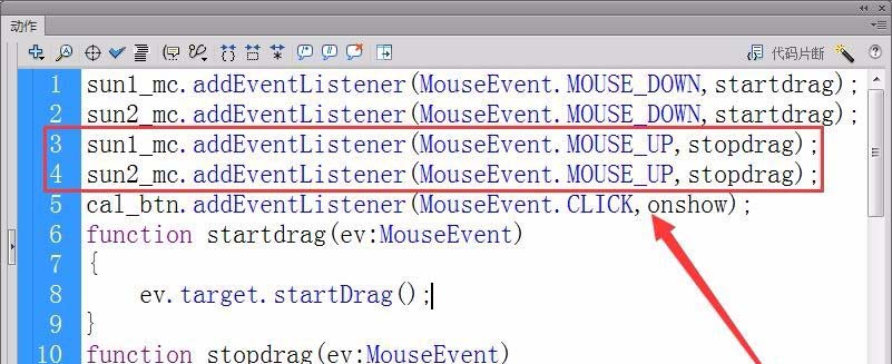 7、接著,注冊對象sun1_mc的鼠標釋放事件的偵聽器,接收者函數為stopdrag。用同樣的方法注冊sun2_mc。