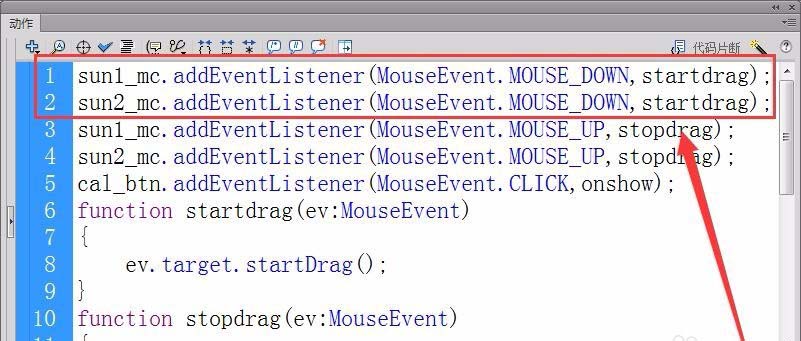 6、首先,注冊對象sun1_mc鼠標按下事件的偵聽器,接收者函數為startdrag。用同樣的方法注冊對象sun2_mc的偵聽器。