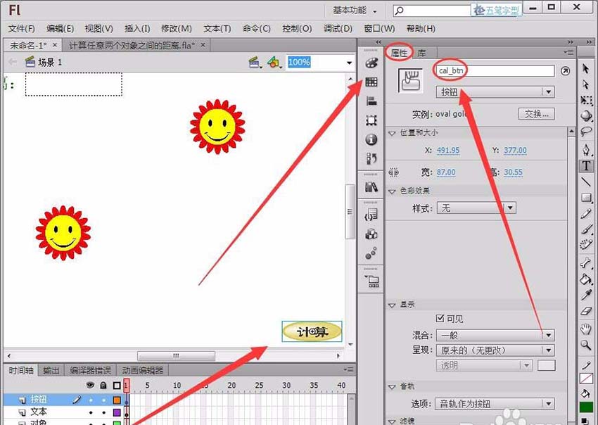 4、新建一個圖層命名為“按鈕”,在圖層的第1幀插入一個按鈕元件,在“屬性”面板中將按鈕元件取名為“cal_btn”。