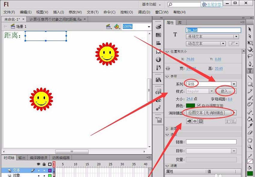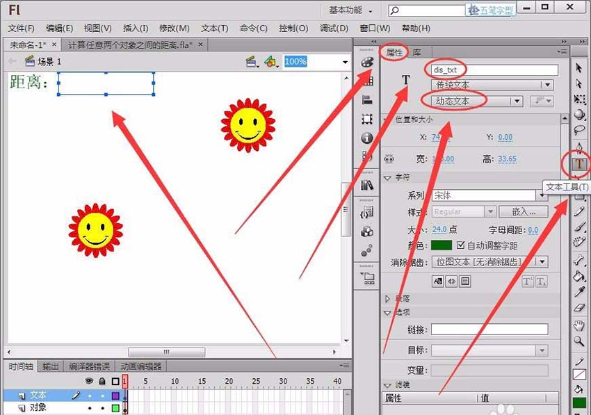 3、在“編輯欄”中選擇“文本工具”,在“屬性”面板中選擇“動態文本”,在舞臺繪制一個動態文本框,將“實例名稱”取名為“dis_txt”。(注:要嵌入字體)