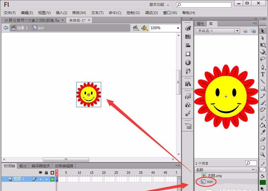 2、回到場景1,將sun影片剪輯元件拖動到舞臺中,在“屬性”面板中將兩個對象的“實例名稱”分別取名為“sun1_mc”和“sun2_mc”。