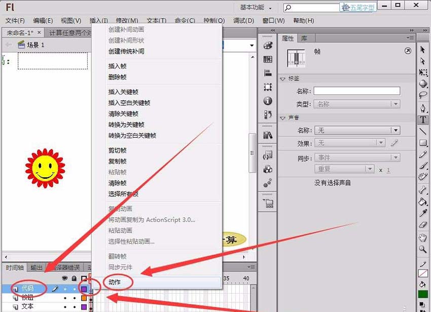 5、新建一個圖層命名為“代碼”,在圖層的第1幀右擊,選擇“動作”選項。