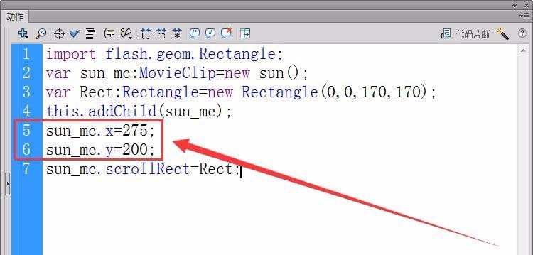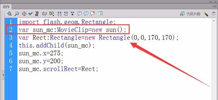 5、首先,定義一個影片剪輯類型的變量sun_mc,引用sun類的實例,用來顯示太陽圖像。