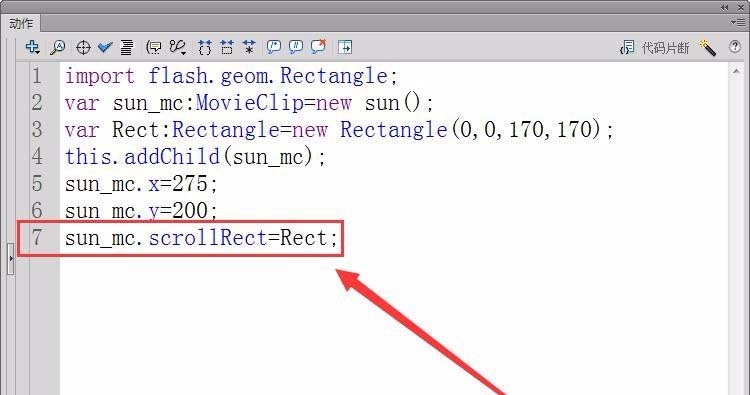 9、最后,設置滾動矩形區域,在舞臺僅顯示圖像Rect的四分之一,用scrollRect屬性實現操作。