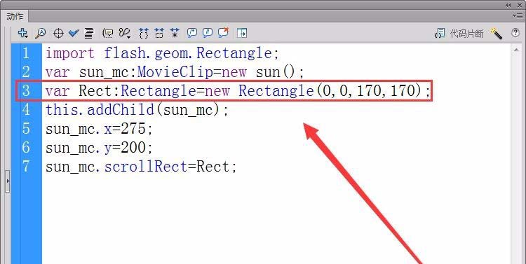 6、定義一個變量Rect創建和引用Rectangle的實例,實例起點坐標為(0,0),寬和高都為170像素。