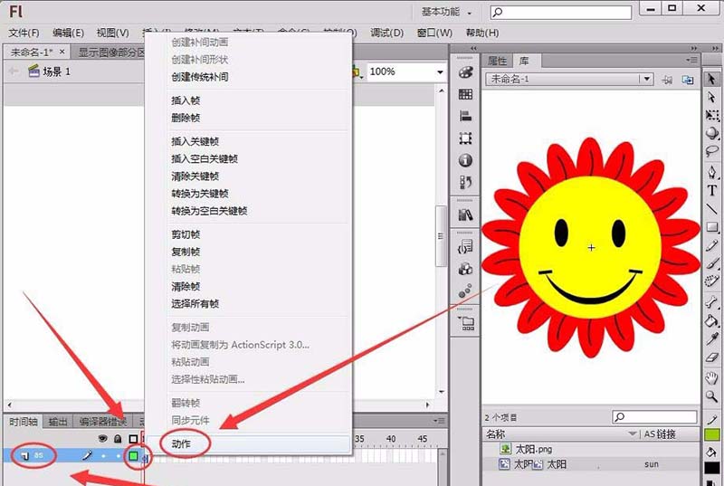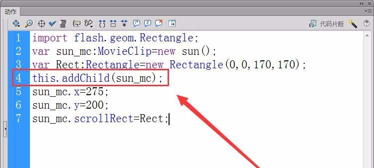 7、將實例sun_mc添加到顯示列表中,使舞臺能夠顯示太陽圖像。