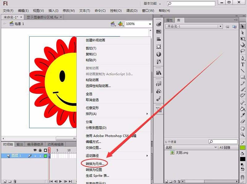 2、在圖片上右擊,選擇“轉換為元件”,新建一個太陽影片剪輯元件。