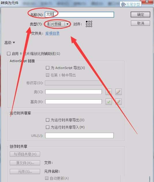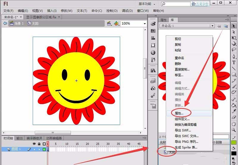 3、將注冊點放置到太陽圖像的中心,在太陽影片剪輯元件上右擊選擇“屬性”,選擇“為ActionScript導出”,將“類”名改為“sun”。