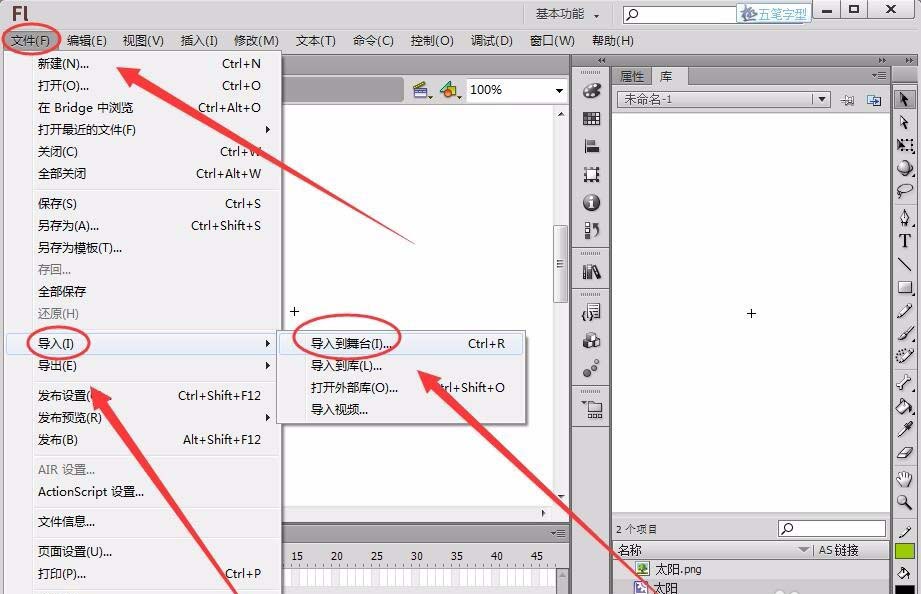1、打開一個新建元件窗口,單擊“文件”---->“導入”---->“導入到舞臺”,在Flash舞臺導入一張圖片。