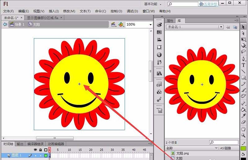 8、接著,設置太陽對象在舞臺中的位置,注冊點坐標為(275,200),即舞臺中心。
